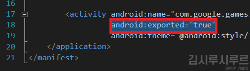 아래쯤에 있는 activity 속성 안에 android:exported="true" 를 추가합니다.