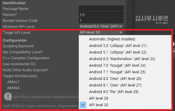 여기서 이제 Other Settings를 보시면 Identification에 Target API Level이 있어요!