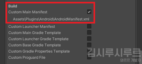 여기 보면 제일 위에 Custom Main Manifest 항목이 있는데, 체크박스에 체크해주세요!