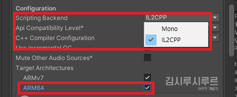 어쨌든 찾으셨다면 거기서 Scripting Backend를 IL2CPP로 설정한 뒤,
