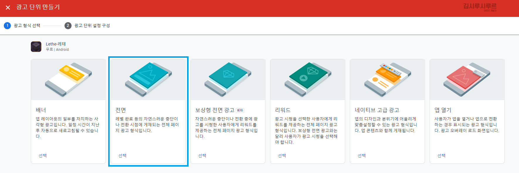 어쨌든 원하는 광고를 선택합니다. 레테의 경우 전면광고가 들어가기 때문에 저는 전면광고를 골랐어요~