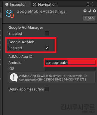 인스펙터 창에서 Google AdMob의 Enabled 항목을 체크해주고,