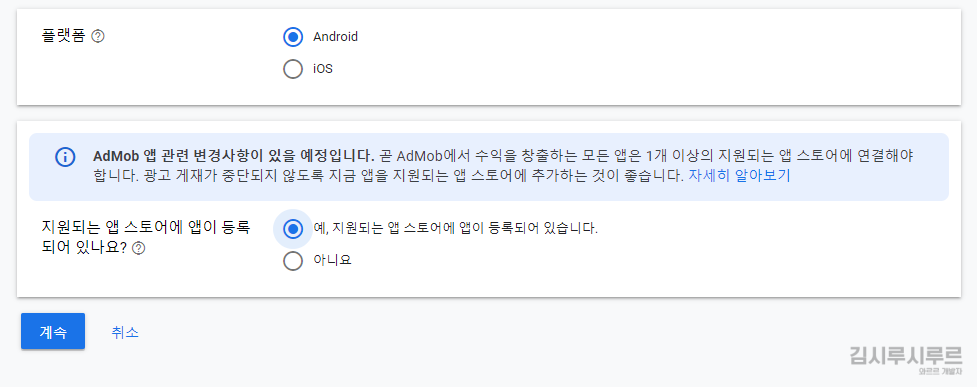 플랫폼을 Android와 iOS 중에서 선택하고, 앱 스토어에 등록되어있는지 여부를 선택합니다.