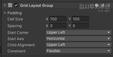 그리드 레이아웃 그룹에서는 프로퍼티의 차이가 조금 있습니다. 다른것만 짚고 넘어가겠습니다~