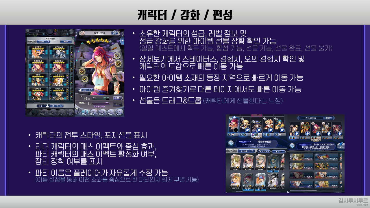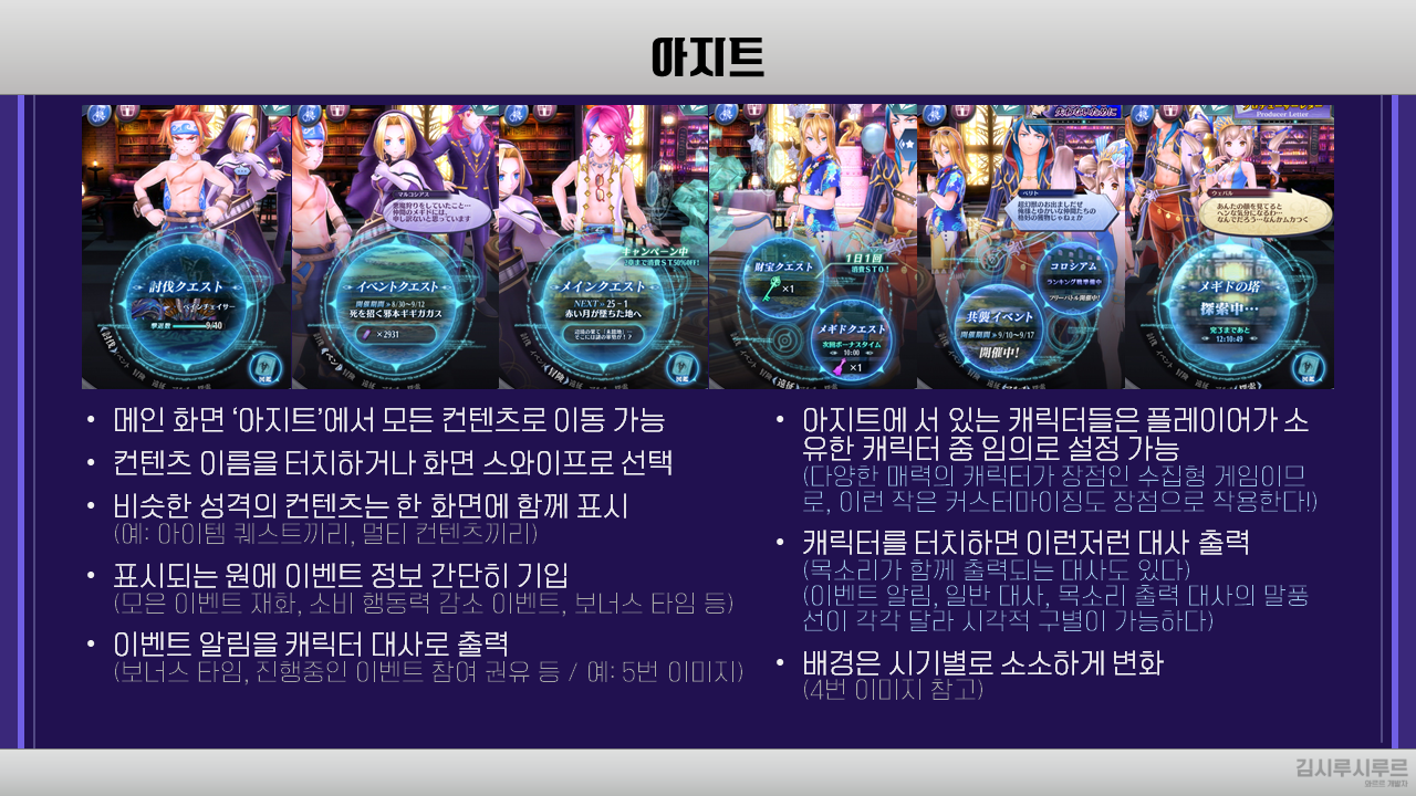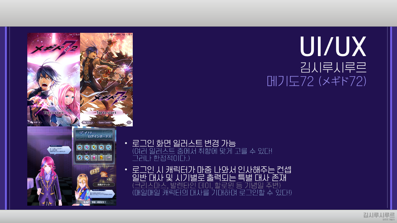 분류 UIUX 목적 개인 과제 하나의 게임 내 UI 요소 캡쳐해오기 (상세할수록 좋음) 메기도72 (メギド72) 파워포인트 2020년 4월 프로젝트라고 하긴 좀 어려울지 모르겠지만 이걸 기반으로 마음에 들었