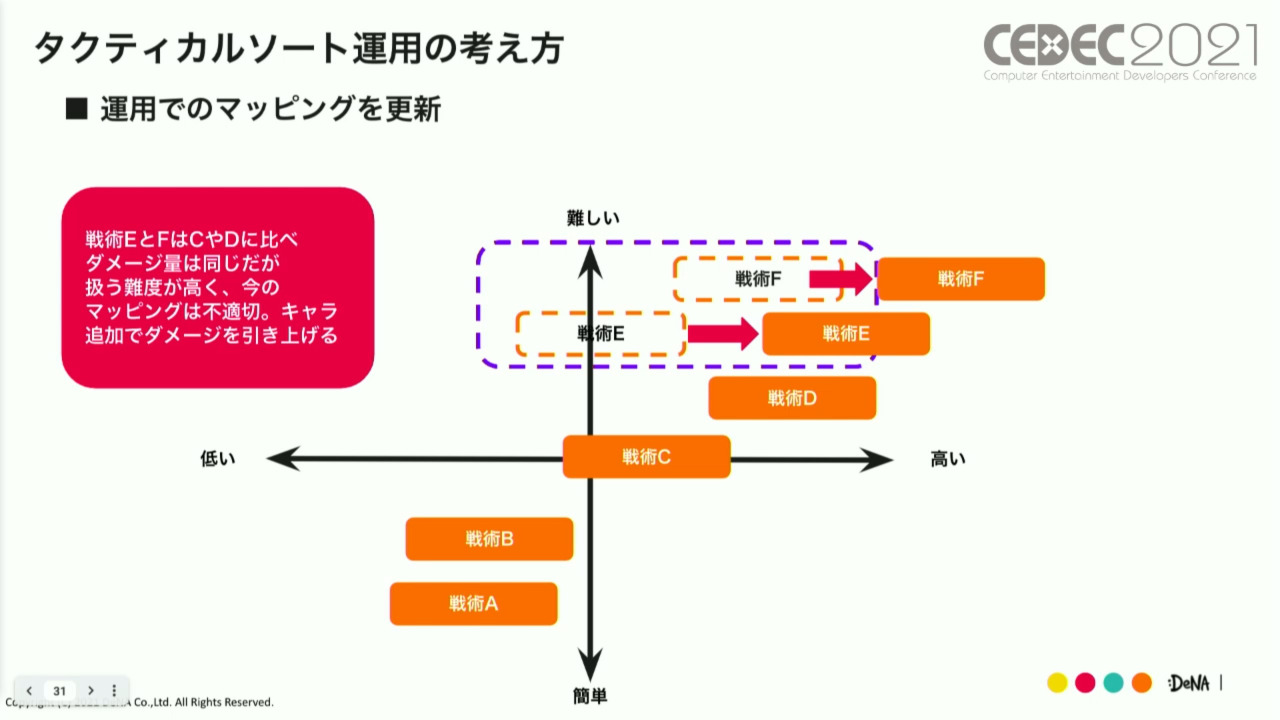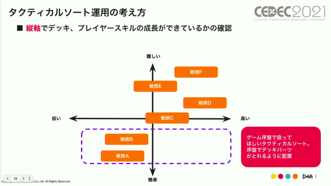이 고집은, 게임 밸런스면에서 어떤 식으로 반영된 것일까. 그 구체적인 예시로서 하야카와 씨는, 복수의 캐릭터에 의해 실현되는 「택티컬 소트」를 소개했다. 택티컬 소트에 따른 새로운 전술을 즐기고 싶다, 는 마음이 가챠를 돌리게 하는 동기부여가 되도록 게임을 디자인했다고 한다.