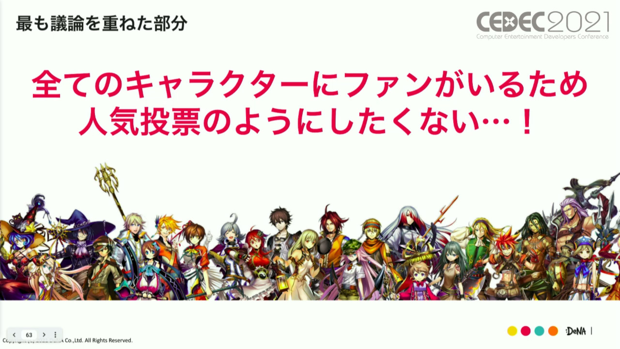 게다가, 게임 상황에 매치하는 캐릭터를 실장하고 싶다고 생각해도, 컨셉을 결정한 뒤부터 실제로 실장하기까지 1년 반 가까이 되는 개발기간을 필요로 한다. 1년 후반의 게임 상황을 생각해서 새로운 캐릭터를 시의적절하게 출시하는 것은 꽤나 어렵다고 한다.