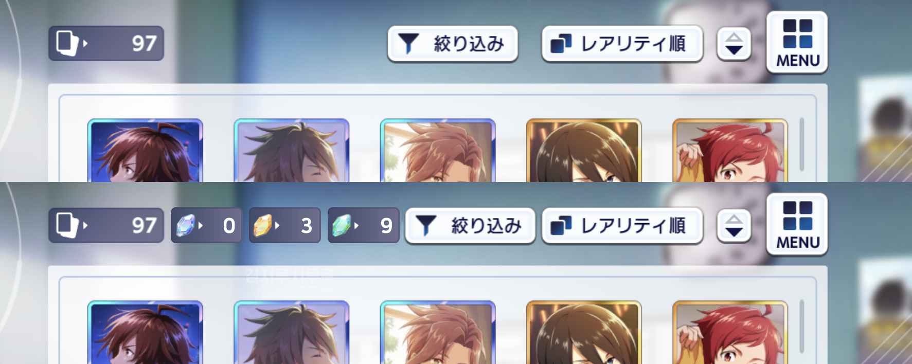 예시에서는 상단 UI에 만능 파편의 소지 수를 각각 등급별로 알리는 상자가 총 세 칸 추가되면서, 상대적으로 터치 영역이 넓은 필터~정렬 버튼 사이의 간격을 줄였습니다.
