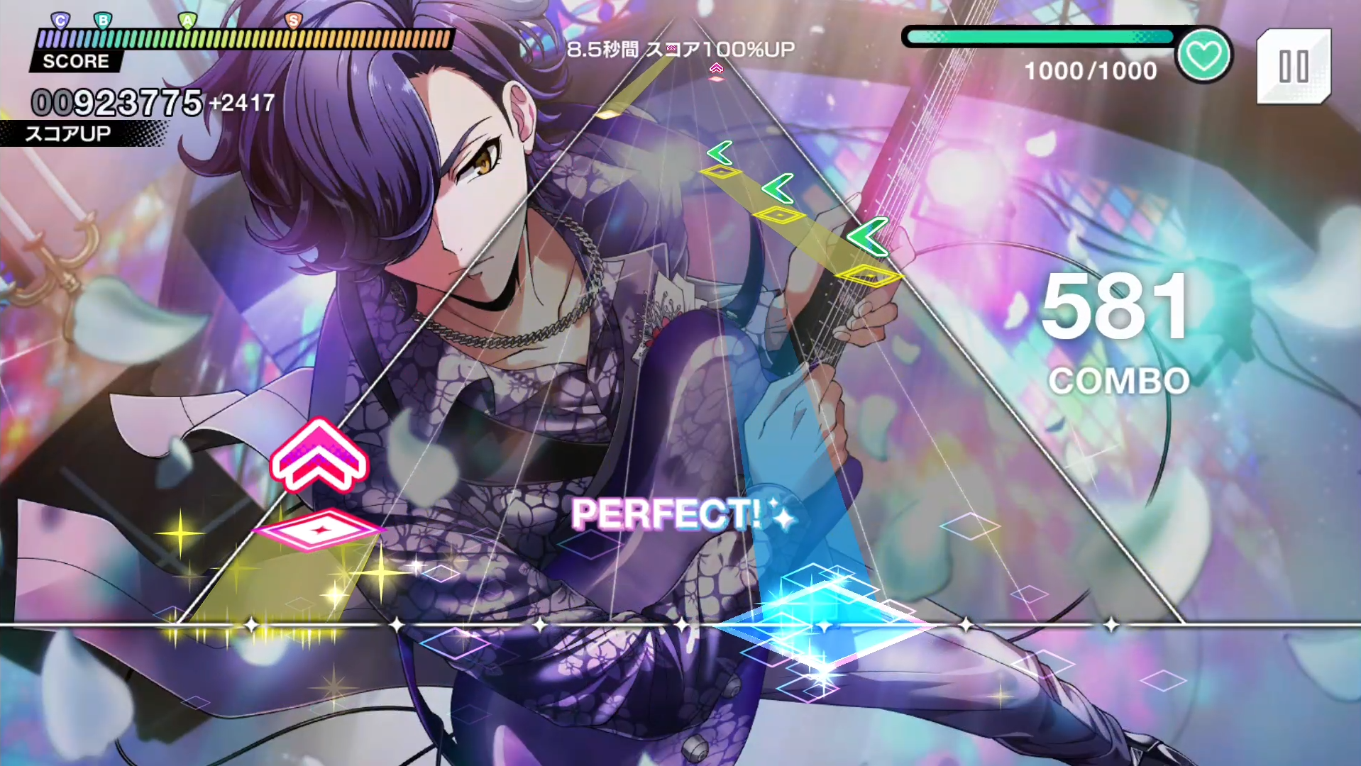 사실 이것도 어느 단계에서 있었던 실패가 아닐까 싶은 게... 요즘 모바일 리겜이 위쪽 화살표로 표시되는 노트를 좀 내놓잖아요. 일반 노트, 롱노트, 좌우 슬라이드 노트에 이어 리겜에 추가된 하나의 암묵적인 고정 노트랄까. 그런데 이게 편의상 위쪽 화살표를 하고 있지만 사실 360도 노트인데 사이스타에서는 오로지! 위쪽으로만 슬라이드 해야 해서 (판정 범위도 엄청 좁음 나쁜 놈들) 약간 다른 리겜에 이게 있어서 가져오긴 했지만 이 노트가 실질적으로 무슨 역할을 하는지는 모른 채로, 생긴 것만 보고 수직 노트로 만들어둔 거 아니야? 하는 의심이 되기 시작한단 말이에요? (이랬는데 진짜 수직으로 작용하는 리겜에서 따온 거면 할 말 없긴 하겠지만) 진짜 콤보치기 너무 힘들어요