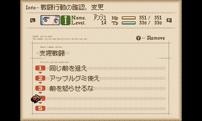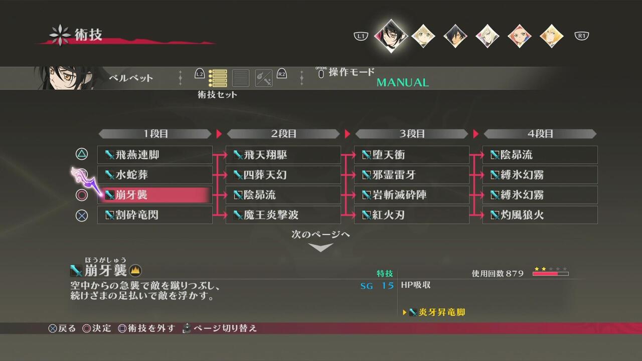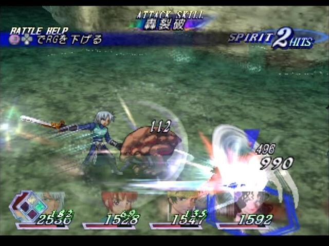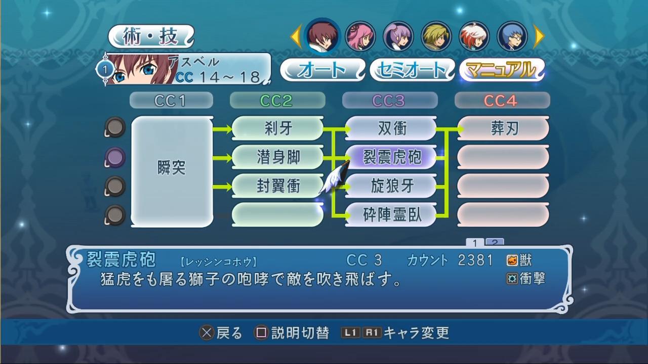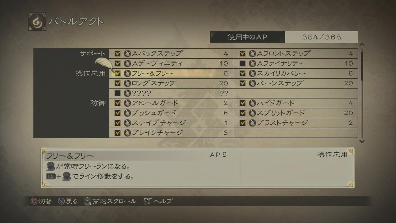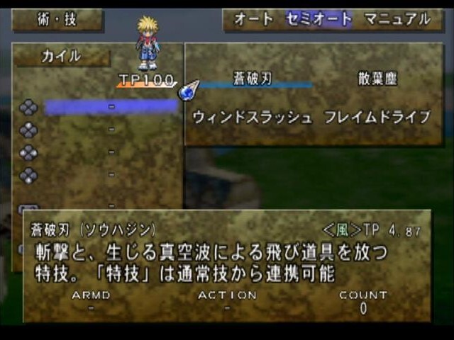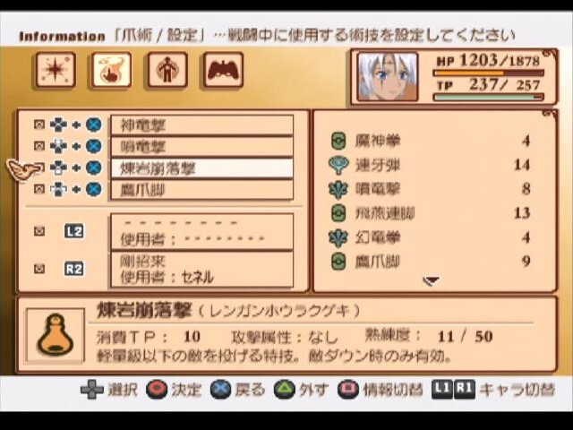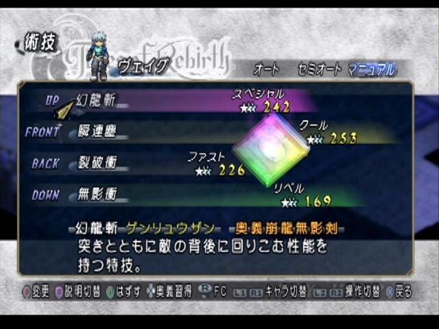 또 일반 공격이 폐지되어, 기본의 공격수단이 술기만으로 되어있다. 술기도 지금까지 그랬던 것처럼 방향키와 특기 버튼의 조합으로 발동하는 것이 아니라, [O], [X], [□], [△] 네 개의 버튼에 세트해서 싸우는 형식이 채용되었다.