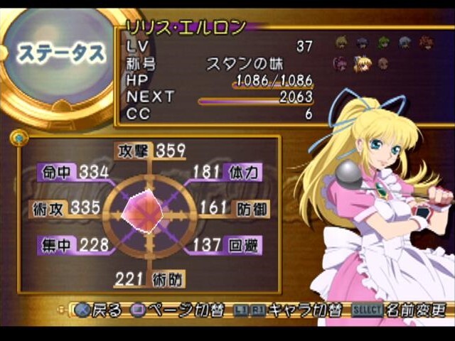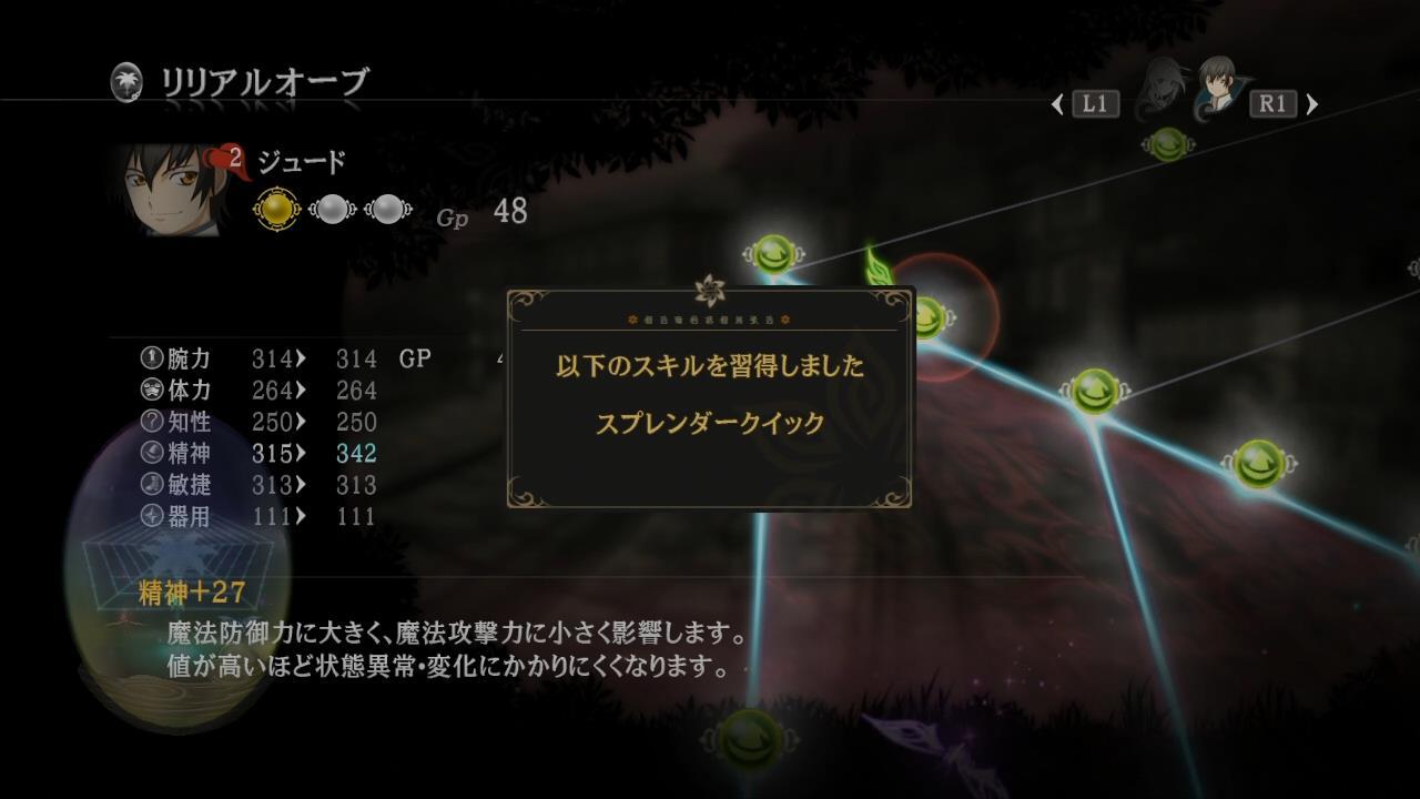 파티 멤버의 육성은 「리리얼 오브」라는 시스템을 사용해서 진행한다. 리리얼 오브에선, 완력, 체력, 민첩 등의 각종 패러미터를 상승시키는 칸(노드)이 배치되어있고, 레벨업 때에 획득하는 GP를 소비해서 노드를 개방한다. 어느 노드를 개방해서 어느 패러미터를 성장시킬 것인가는 완전히 플레이어에게 맡겨지기 때문에, 육성 방침을 정해 가는 재미가 있다.
