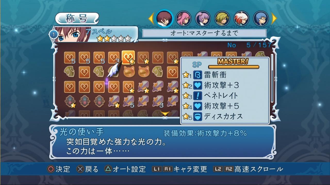「그레이세스」에서는 칭호와 캐릭터의 성장 관계도 다시 짜였다. 지금까지의 시리즈에서는 장비한 칭호에 따라 레벨업 시의 패러미터 성장에 보정이 들어가거나, 패러미터 그 자체가 성장하곤 했다. 본 작에선 칭호마다 「마스터리 스킬」이라고 불리는 것이 설정되어있어, 장비한 채 전투에서 승리해 쌓이는 포인트를 모으면, 술기를 얻거나 패러미터를 성장시켜준다. 칭호는 시나리오 진행에서 어느 정도 얻을 수 있지만, 서브 이벤트로도 획득할 수 있기 때문에 적극적으로 이벤트를 회수하는 것이 보다 많은 칭호를 손에 넣을 수 있게 해 준다. 술기의 획득 스피드나 위력에도 직결되므로, 되도록 많은 칭호를 모으는 것이 강해지는 지름길이었다.