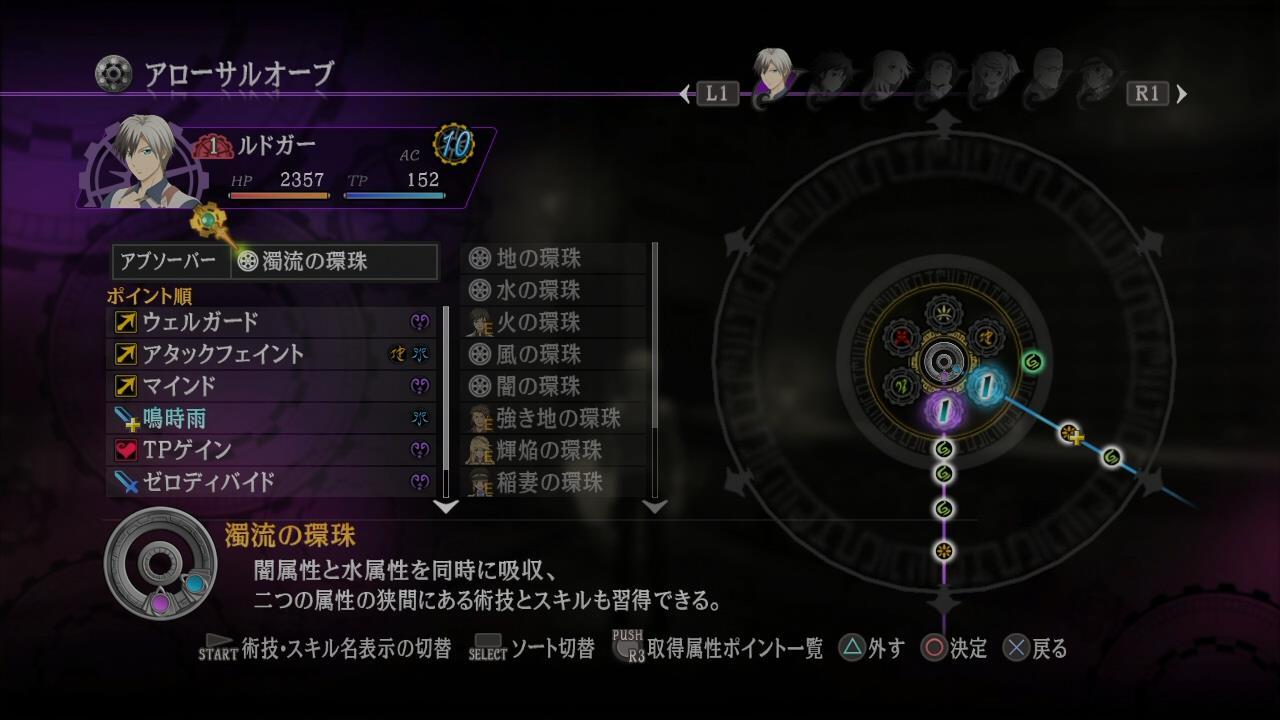 손에 넣은 엘리멘탈 코어를 어떻게 나누어 쓸지는, 장비하고 있는 「앱소버」에 따라 결정된다. 어느 속성을 성장시키는가에 따라 습득할 수 있는 술기가 크게 변화하기 때문에, 플레이어는 지금 어느 캐릭터가 어느 앱소버를 장비하고 있는지를 파악해서, 성장도를 신경 써줄 필요가 있다.