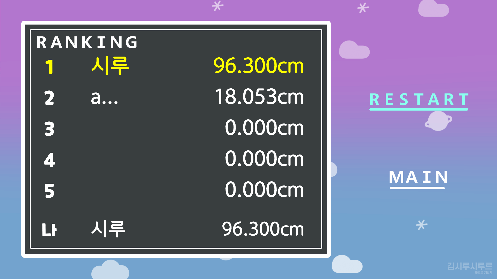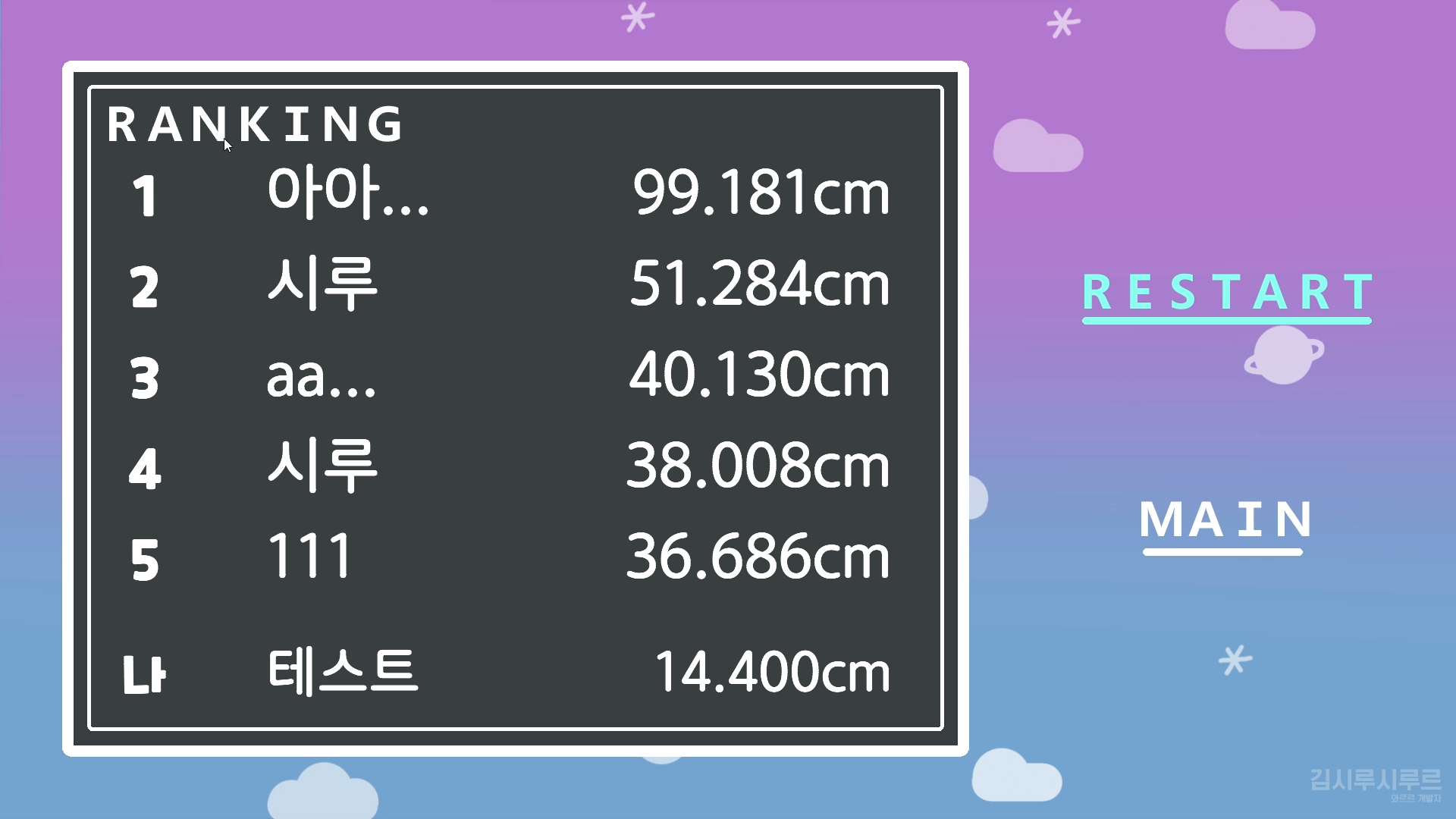 이름과 점수 각각의 텍스트 박스로 구성되어 있고, 지금까지의 1~5위와 나의 점수를 보여줍니다.