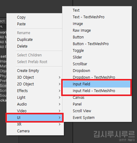게임오브젝트 항목에서 UI → Input Field로 만들 수 있습니다.